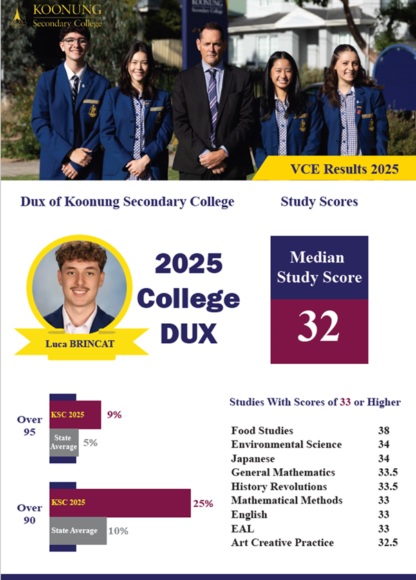 We are pleased to share that the high-level achievement of our students saw a Median study score of the College of 32. This sees the achievement of our Koonung students amongst the best of government schools in Victoria. Congratulations to all of our students for their hard work and achievement, a big thank you to our brilliant teachers and support staff for their work and thank you to you, our families, for your support as we work together to see our Koonung students work hard to achieve their goals and aspirations.