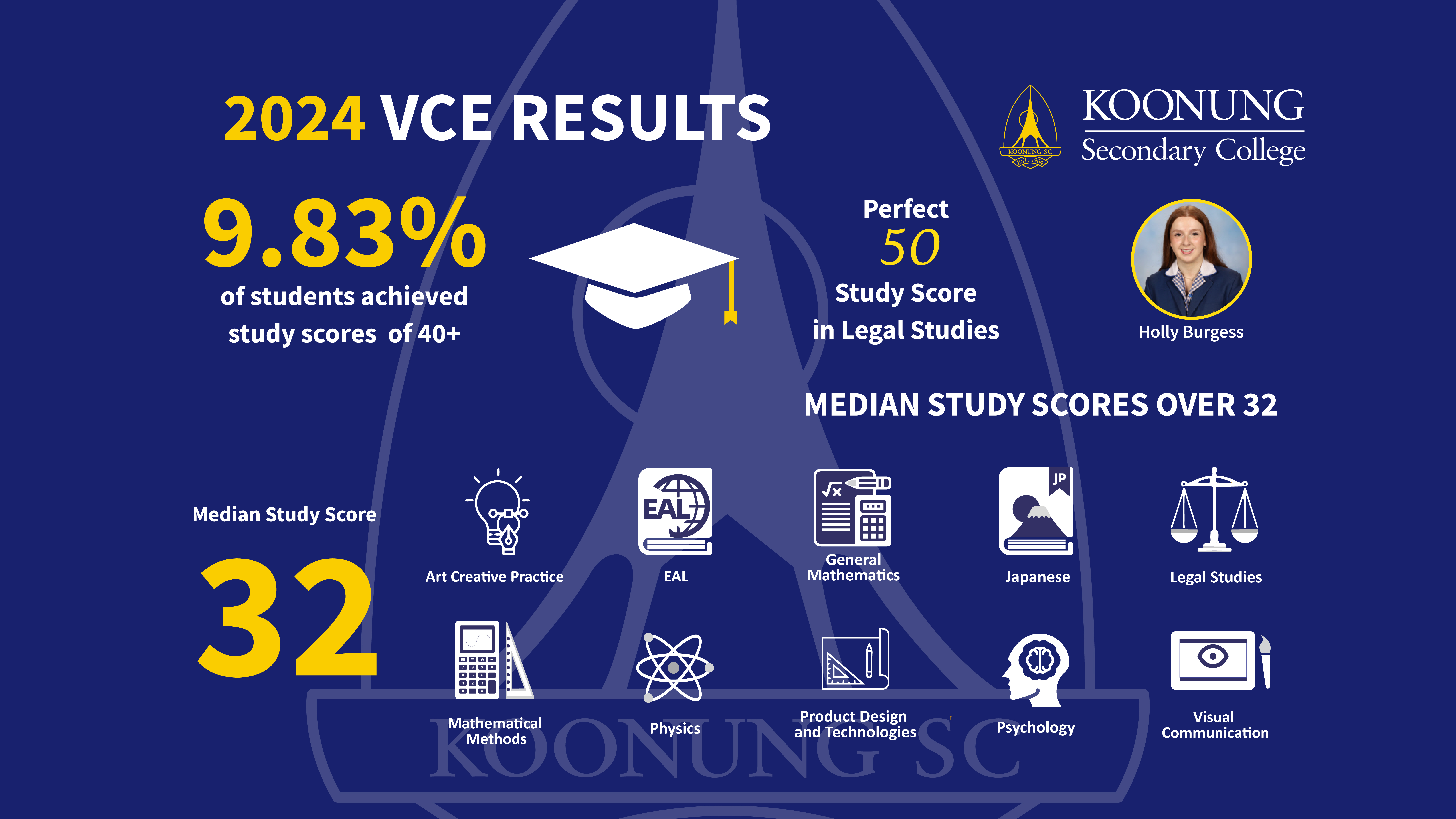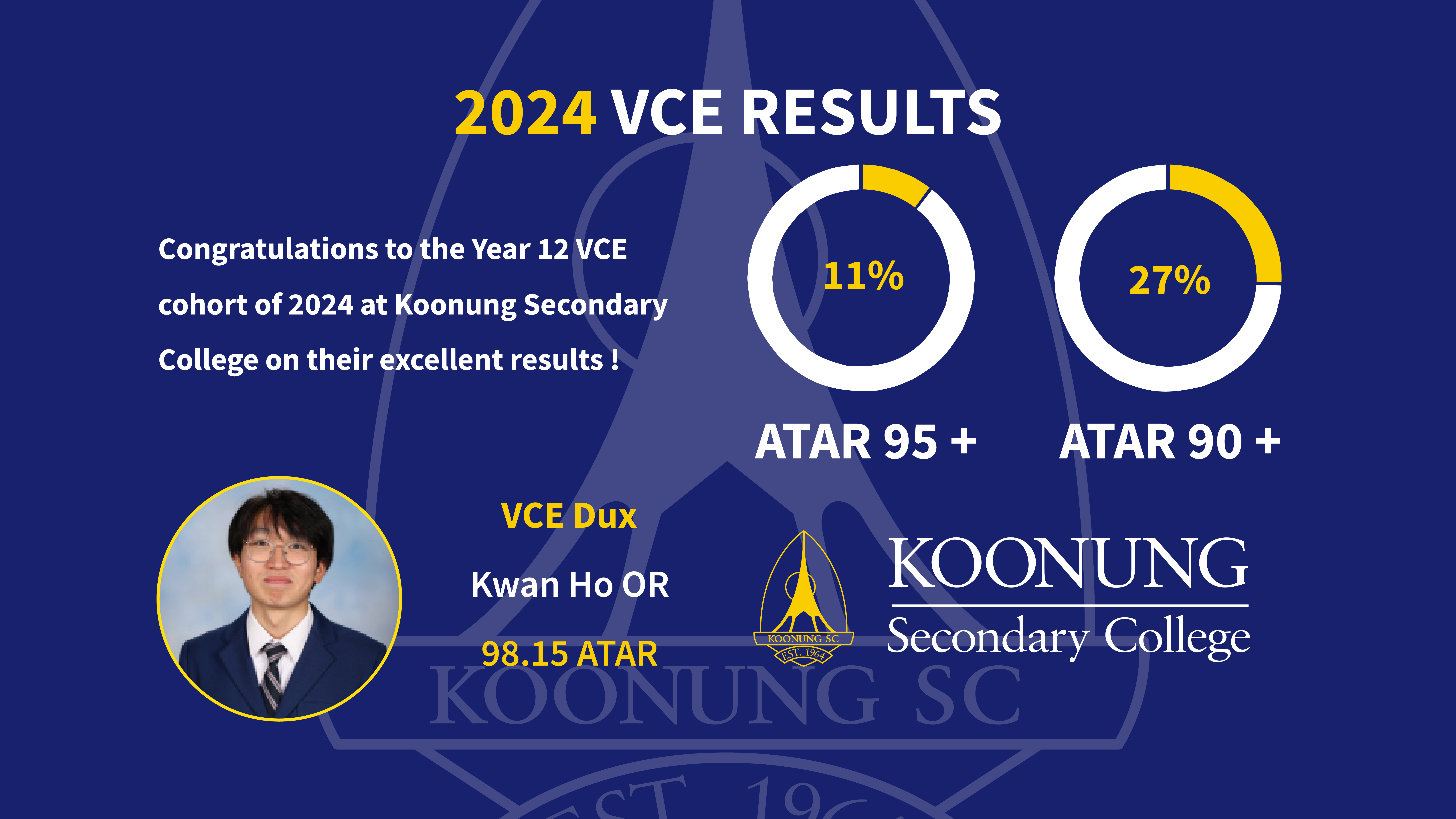 We are also pleased to share that the high-level achievement of our students saw a Median study score of the College of 32. This sees the achievement of our Koonung students amongst the best of government schools in Victoria. Congratulations to our students for their hard work and achievement, a big thank you to our brilliant teachers and support staff for their work and thank you to you, our families for your support as we work together to see our Koonung students work hard to achieve their goals and aspirations.