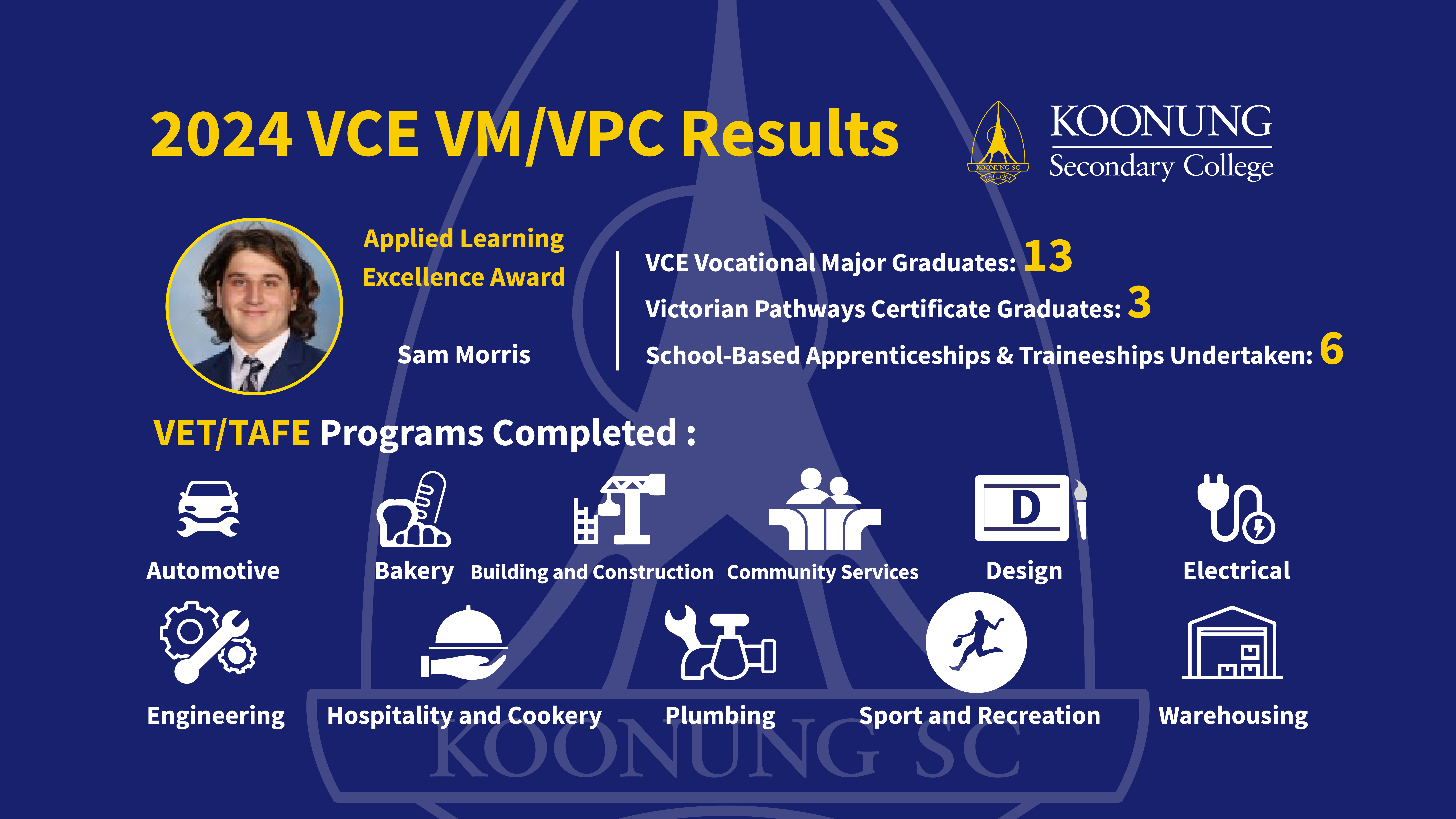 Before I outline the exceptional achievement of our 2024 cohort of students, I would like to remind all families that the ATAR and scored VCE is just one of the pathways available for students at Koonung. Together with scored VCE, some students undertake a non-scored VCE and in 2024 we saw the first graduates of the VCE Vocational Major (VM), in which students can undertake VET and School-based apprenticeships and Traineeships to achieve the VCE VM. I am particularly proud of the multiple pathways of our VM students, including Automotive, Bakery, Building and Construction, Electrical, Hospitality and Cookery, Design and Engineering. However, the vast majority of Koonung students (over 87% of students) undertake a scored VCE.